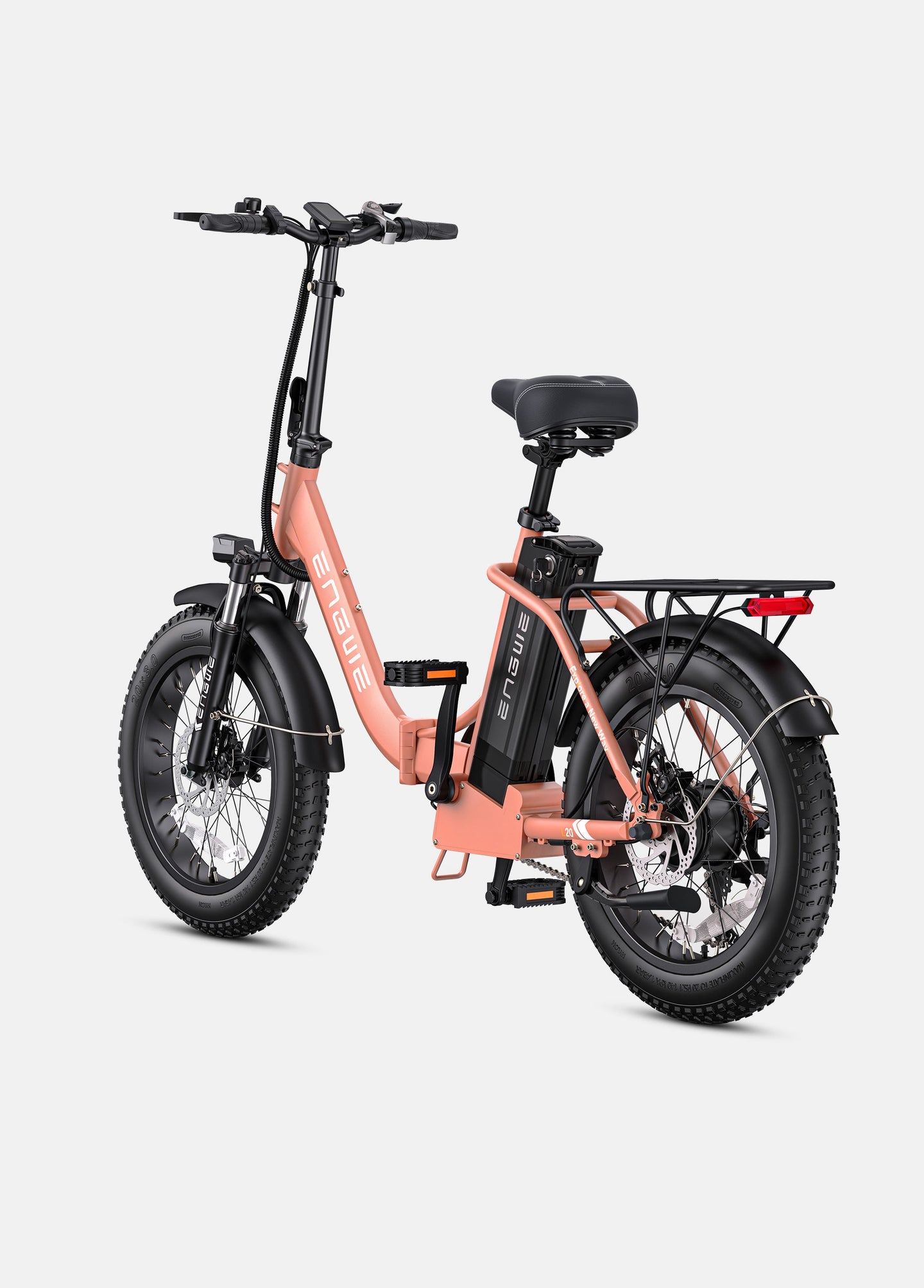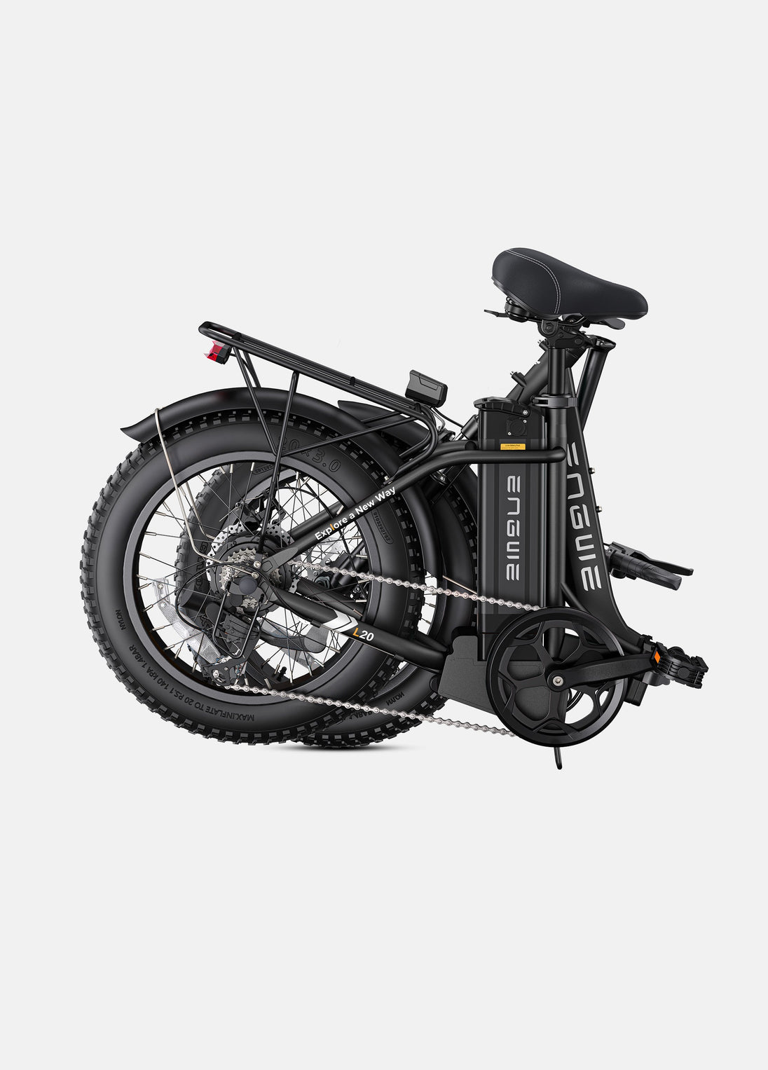 The 20*3.0-inch fat tire is one of the most noteworthy highlights of the Engwe L20 2.0. This fat tyre electric bike can better absorb vibrations, allowing you to pass through different terrains more smoothly, such as gravel roads, sand roads, snow, etc., giving you the opportunity to unlock more terrains and explore a more exciting world.